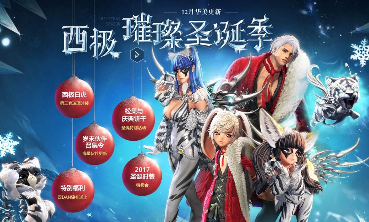 《剑灵》西极璀璨圣诞季全新版本开启,全新圣诞套装红色雪花上线,更新第3套璀璨套装——西极白虎,全新幻影技能系统,个人试衣间与首批可以进行服装设计的服装上线。下面我们一起来看看吧。