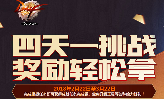 在春节来临之际,DNF除了给各位小伙伴推出了“每日签到送好礼”的活动,还推出了“四天挑战奖励轻松拿”的活动。这个活动参加后,完成挑战任务即可获得超级丰厚的奖品!这对于各位喜欢不断挑战的小伙伴来说犹如探囊取物!那这个活动都有哪些挑战任务等待完成呢?马上和小编一起