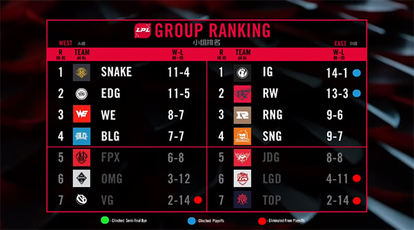 由于LPL赛区的常规赛赛程更长,并且使用东西部分组赛制,目前季后赛出线名额还不够明朗。IG、RW、Snake和EDG由于积分较高,已经提前锁定了季后赛的四个席位,而其他四个席位则是竞争非常激烈,鹿死谁手尚未知晓。东部由RNG、SNG和JDG进行争夺,西部由WE、BLG和FPX进行争夺,谁能够在余下的两周赛程中拿到更多的胜场,就能够有更大的机会晋级到季后赛中。