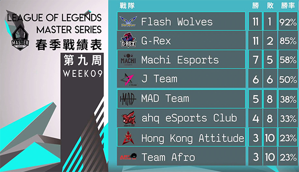虽然闪电狼在今年进行了人员调整,但新阵容却展现了强大的能力,他们引入韩援的决定起到了成效,拿到11-1位列头名。而英皇集团投资的新军G-Rex目前紧随其后取得11胜战绩,和闪电狼提前锁定了季后赛名额。在最后一周的常规赛中,M17、JT和MAD将要竞争剩下两个季后赛名额,开启了抢分大战,AHQ由于西门暂离赛场在新赛季步履蹒跚。