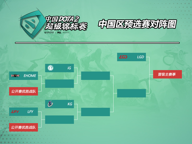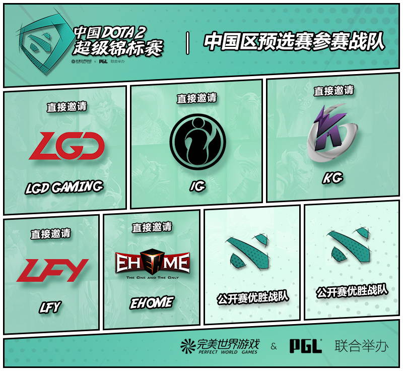 中国区预选赛将在4月22日-23日进行,直接邀请队伍分别是LGD、iG、KG、LFY、EHOME,剩余两支队伍将通过公开赛决出,其中LGD在预选赛阶段将直接受邀进入决赛,iG和KG将直接进入预选赛第二阶段。具体的赛制及对阵情况我们将在抽签后4月18日公布,请玩家关注官方资讯。