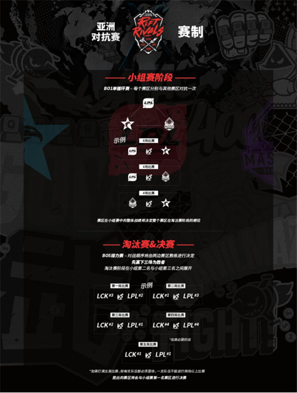 每个赛区的春季赛殿军、季军、亚军、冠军,将会与其他两个赛区的同排名队伍进行Bo1单循环对抗,赛区整体小组赛的战绩将决定整个赛区在淘汰赛阶段的顺位。