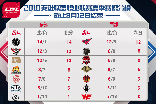 图2:截止8月12日LPL东西部积分榜