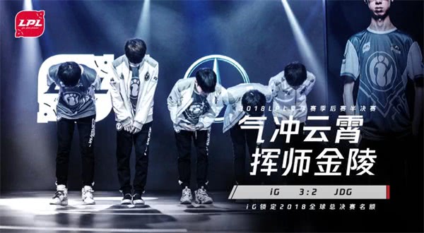 9月10日晚,在2018LPL相爱级赛第二场半决赛上,IG鏖战五局击败JDG,顺利晋级总决赛,成功会师RNG。进入决赛后的IG拥有积分仅次于RNG,因此也确定获得了2018英雄联盟全球总决赛的参赛资格。