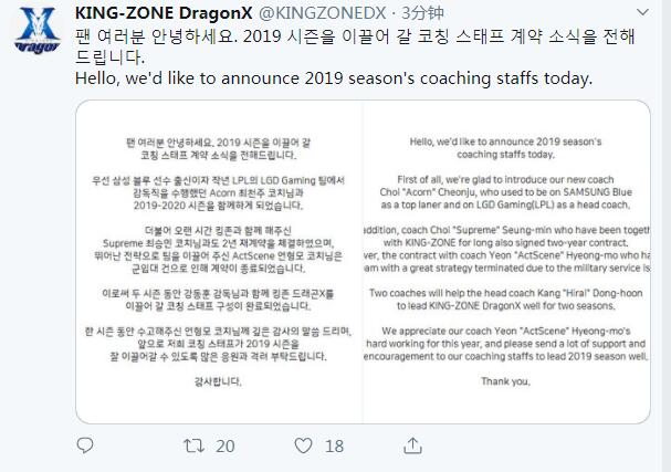 今日,KZ战队通过推特宣布,2019年教练组将发生调整,与原教练Supreme续约两年,Actscene教练合同已到期,原LGD教练Acron加入。
