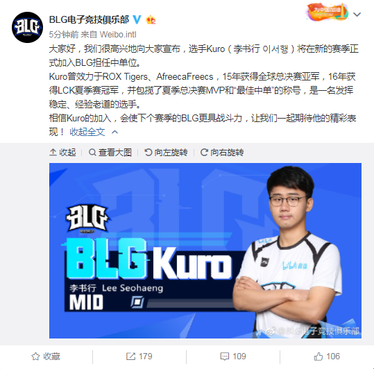 今日,BLG官方通过微博宣布,原LCK赛区AFs战队的中单选手Kuro正式加入,曾效力于GE Tigers战队,并夺得了2015年全球总决赛亚军、2016年全球总决赛四强。