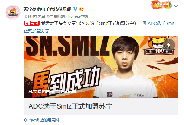 苏宁终于在今天官宣了他们的AD选手——SMLZ正式连接。苏宁在官宣文案中表示SMLZ会尽快与战队进行磨合,一起征战接下来的比赛。虽然这个消息已经在粉丝间人尽皆知了,但是官宣之后粉丝才算吃了一颗定心丸。