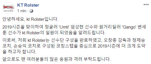 2019年,“UmTi”严圣贤(音译)选手和AD Gango卞世勋(音译)选手成为kt Rolster的一员。