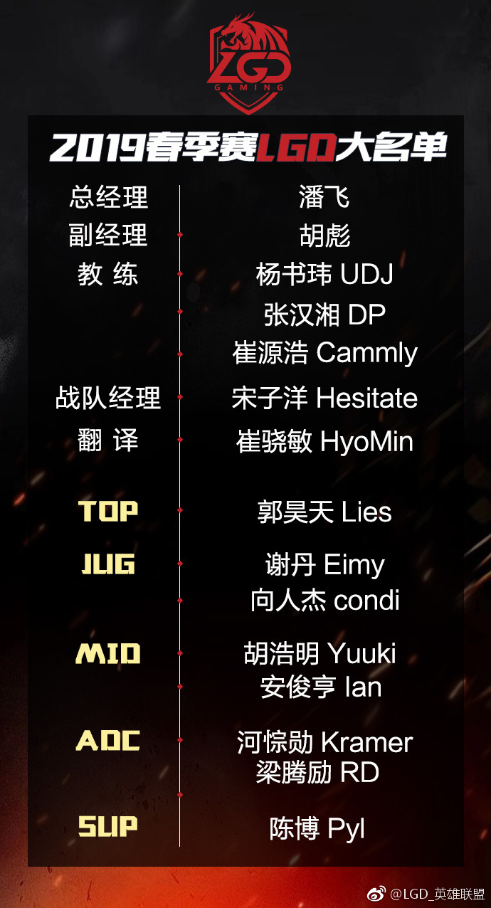 在经历2018年冬季转会期人员调整之后,LGD战队官方在微博平台上公布了2019春季赛大名单,Kramer、Lies、condi、RD正式加入LGD。