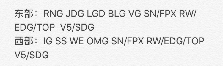 ②按主场地域划分为东西部赛区:RNG(北京)、JDG(北京)、LGD(杭州)为东部赛区,SS(重庆)、WE(西安)、OMG(成都)为西部赛区。