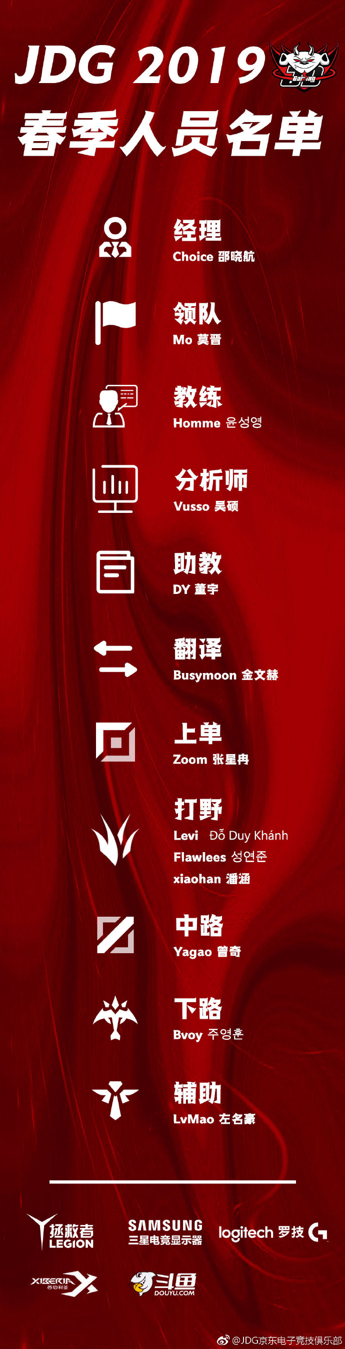 今日,JDG战队通过微博平台公布了2019LPL春季赛阵容大名单,红米继续担任主教练,越南籍打野选手Levi加入。