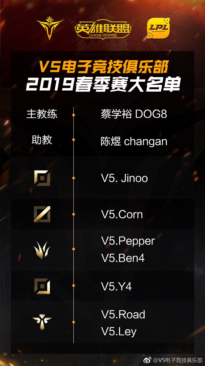 V5电子竞技俱乐部英雄联盟分部新赛季名单: