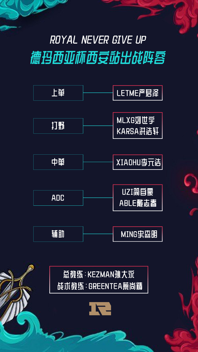新赛季RNG战队在保持原队员阵容下,补强打野以及ADC位置,原RYL青训队打野选手S1xu、AD选手Wink将正式调入RNG。孙大永将继续担任战队总教练一职,原MAD战队教练Greentea加入教练组担任战术教练,并在德杯期间暂替孙大永完成BP工作。