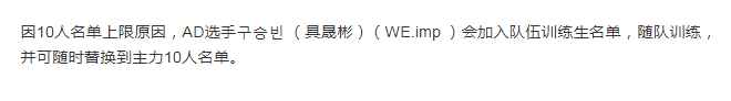 转会期落下帷幕后,WE战队公布自己新赛季的大名单,在名单中,大家可以发现,S4世界冠军AD,前SSW的王牌ADC选手Imp因大名单名额不足,被划分到了训练生当中。