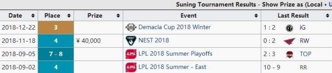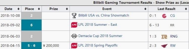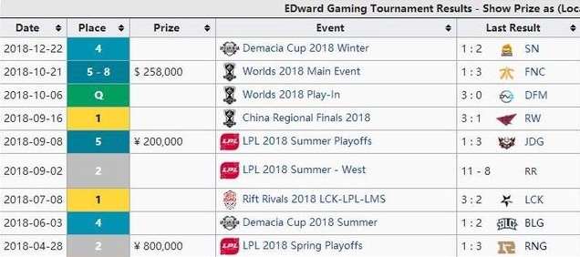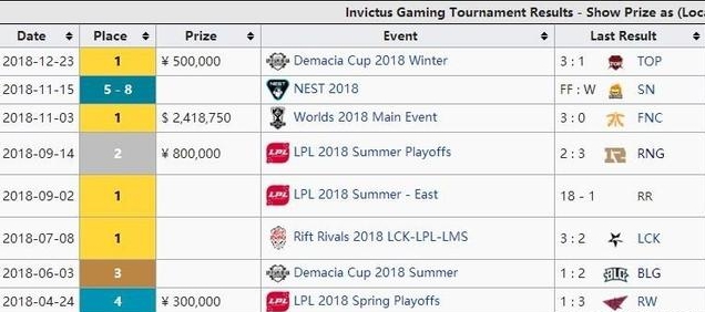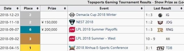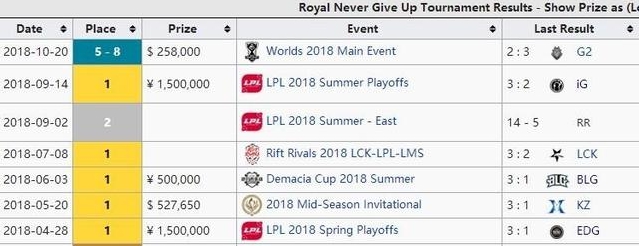 除了IG之外,RNG应该是2018年最成功的战队,除了S赛之外,基本上全部包揽,首先是LPL春季赛冠军奖金150W人民币,之后是MSI冠军52W美元,后面是德玛西亚杯夏季赛冠军50W人民币,接着是LPL夏季赛冠军150W人民币,最后是S8全球总决赛八强奖金26W美元,2018年总共拿到的奖金是886W人民币,不到IG总奖金的一半。