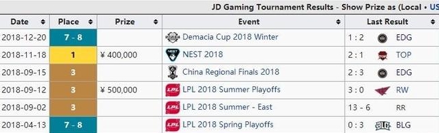 那么来看看差一步打进LPL的JDG战队,JDG在整个2018年所获赛事奖金只有两个,一个是LPL夏季赛季军奖金50W人民币,一个是NEST冠军40W人民币,整个2018年的赛事奖金一共是90W人民币。