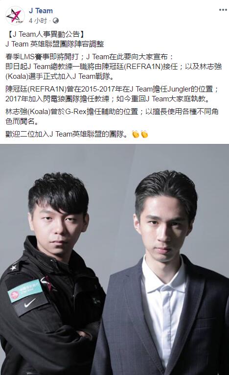 即日起J Team总教练一职将由陈冠廷(REFRA1N)接任;以及林志强(Koala)选手正式加入J Team战队。