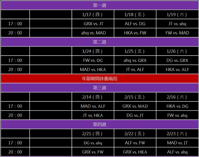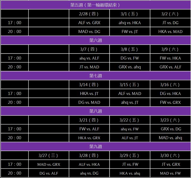 本季例行赛日程如下,每个比赛日将有 2 场对战组合,自 17:00 开始进行对战,将依 第一场对战结束时间提前或延后第二场对战开始时间,欢迎透过【全家 FamiPort 售票系 统】购票前来电竞馆现场体验热烈的赛事气氛,或是锁定直播频道【Garena 直播频道】 准时收看精彩的 LMS 赛事。