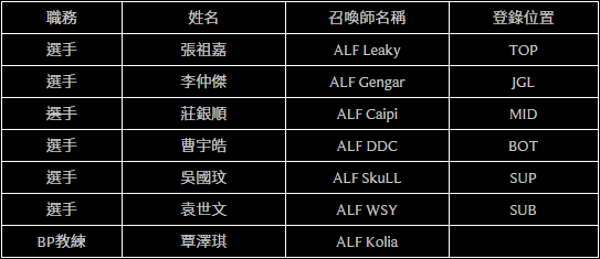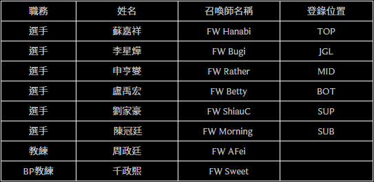 LMS 季赛六连霸的FW 在两位灵魂人物「SwordArt」及「Maple」离队后带来的冲击肯定不小,本季决定引进前M17 打野好手Bugi 并向LCK Griffin 借将Rather 组成全新闪电狼,能否延续传奇令人存疑。