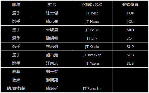 「五个韩服菁英怎么输?」的玩笑话充斥着整个社群,即便拥有傲人的天梯实力加上教练风哥的加入仍无法带领队伍前进 2018 夏季冠军赛。新的赛季 JT 决定补强 SUP 位置,将 GRX 重要战力 Koala 纳入麾下,队伍能否再进一步值得期待。