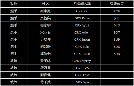 GRX 今年世界赛入围赛表现优异,成功挤进小组赛中,虽无缘继续晋级仍然获得注目。 Toyz 教练在世界赛后曾喊出本季倾向不用韩援,最后却把 Raise 给留了下来,究竟猎人们在想什么?是否 Raise 真的价值连城?在闪电狼毫无发挥空间的 Atlen 来到 GRX 会有怎样的表现呢?