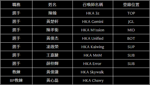 HKA 上季韩援表现不差,但整体成绩却不甚理想,本季补上前 M17 中上路 3z 及 M1ssion,希望解决语言隔阂再创佳绩。回归的东山稳坐中路先发,渴望完整出赛已久的他能为老东家做出什么贡献呢?