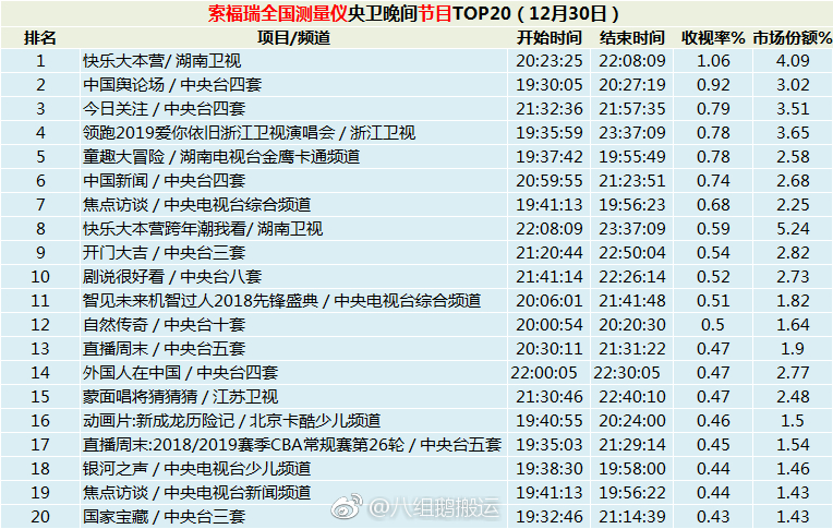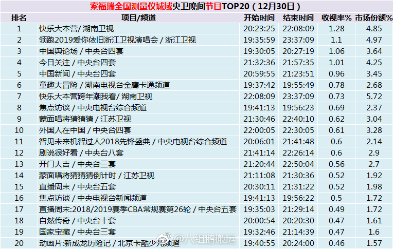 今天,微博公布了全国12月30日的收视率排行,可以看到的是IG上快乐大本营那期直接荣登全国第一!