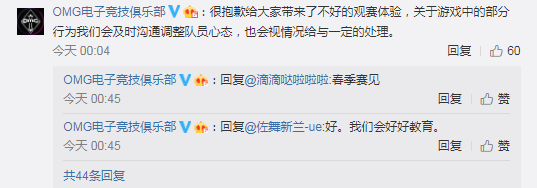 在这场比赛中OMG队员出现了提前退出游戏等举动,受到了粉丝的质疑,OMG官博做出回应,称将及时沟通调整队员心态。