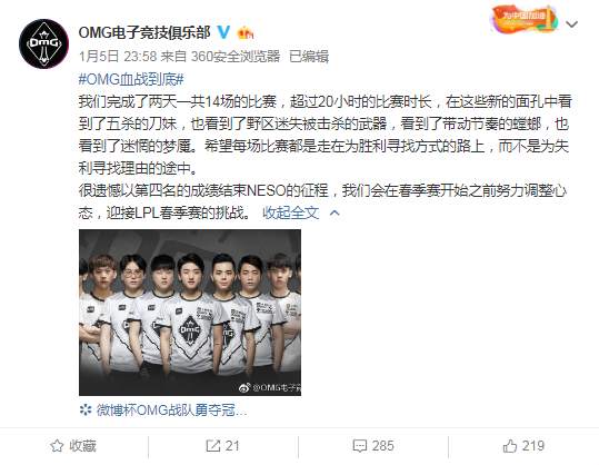 近日举行的NESO全国电子竞技公开赛中,OMG战队1:2不敌VG战队止步四强。OMG官博赛后发文对本次比赛进行了总结。