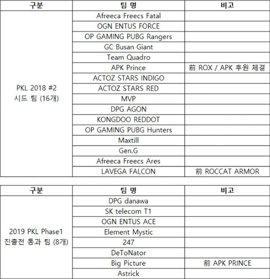 2018年PKL总积分前16名自动获得了新赛季参赛资格,另外有八支战队成功通过预选获得了新赛季的参赛资格。新进入到PKL的八支队伍分别是:DPG danawa、SKT、OGN Entus Ace、Element Mystic、247、DeToNator、Big Picture和Astrick。