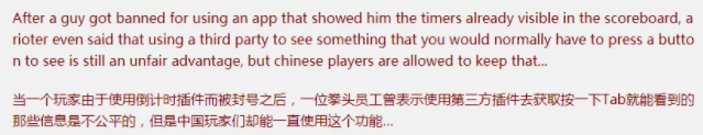 然而又引来了老外们极度不适,原来欧美玩家也有用过插件来计时,但很快就被拳头封禁了,因为拳头是禁止使用第三方插件的。