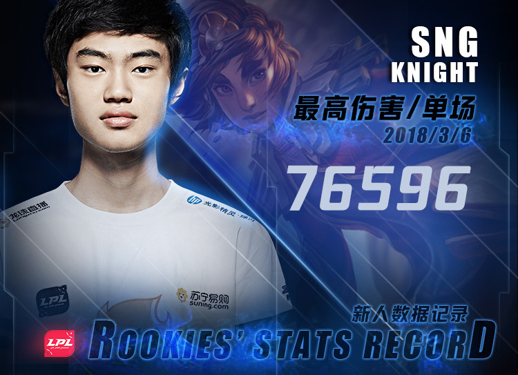 2018年新秀单场最高伤害记录,由当时SNG的中单Knight选手在3月6日对阵WE的比赛中创下。那场耗时接近60分钟的鏖战里,Knight的岩雀打出了76596的伤害,占到全队输出的50%。