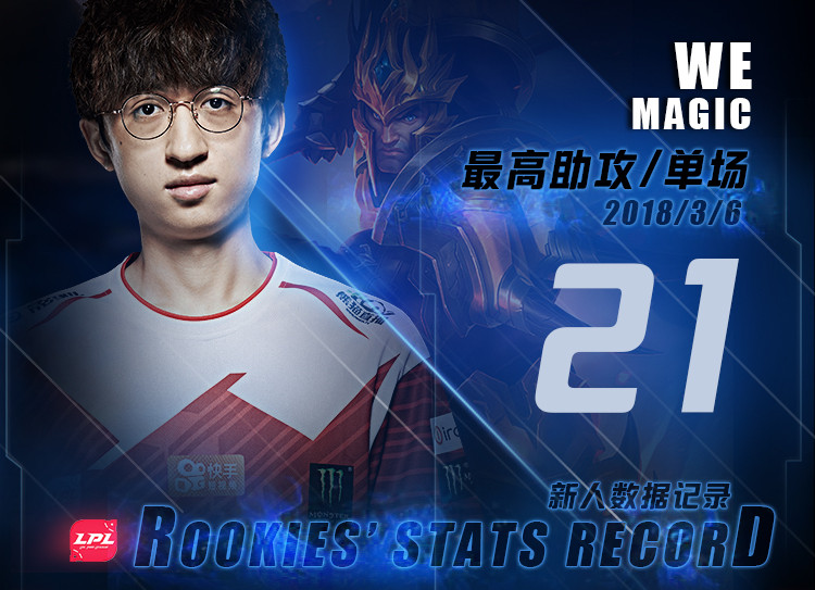 新秀单场助攻记录由WE的新人打野Magic创造,在3月6日WE对阵SNG的比赛里,Magic使用皇子送出了21次助攻,帮助WE完成了鏖战60分钟的翻盘。