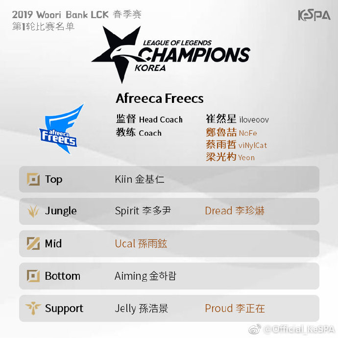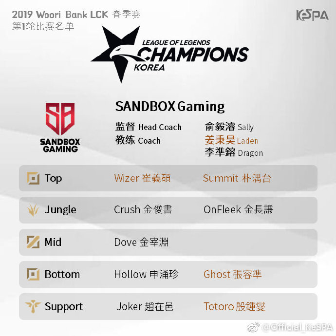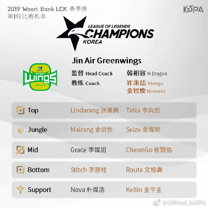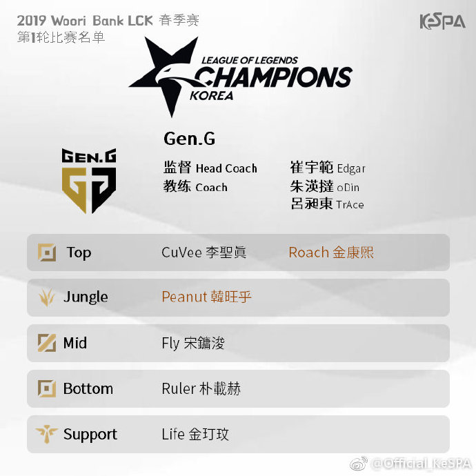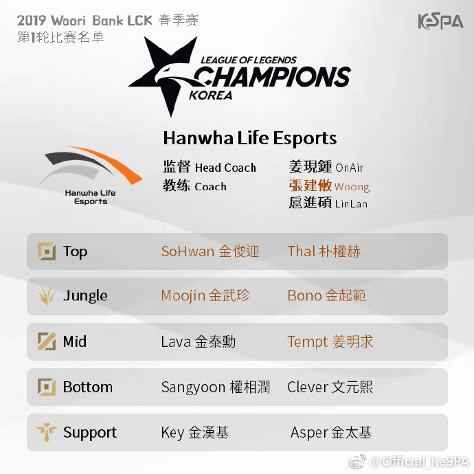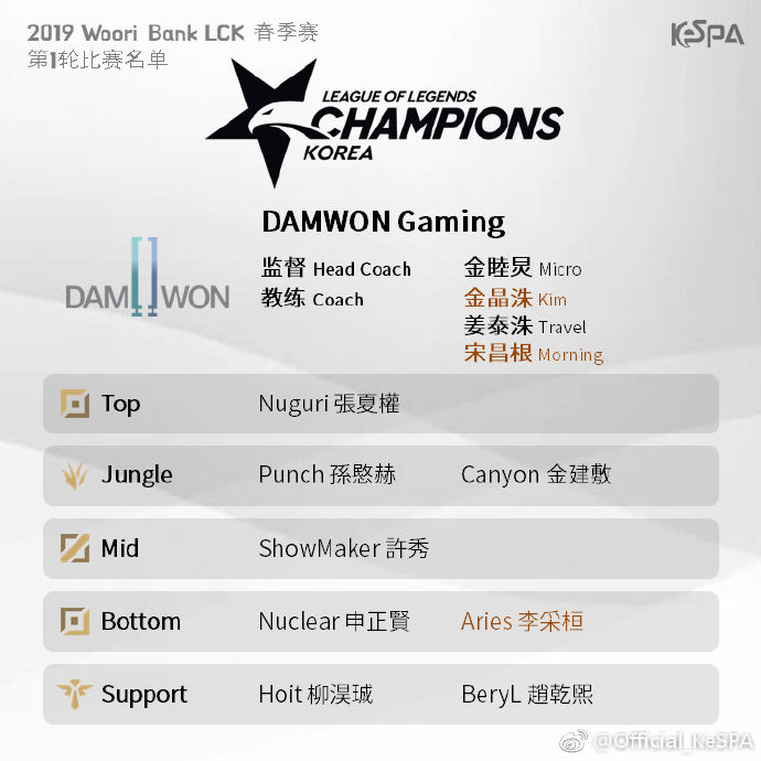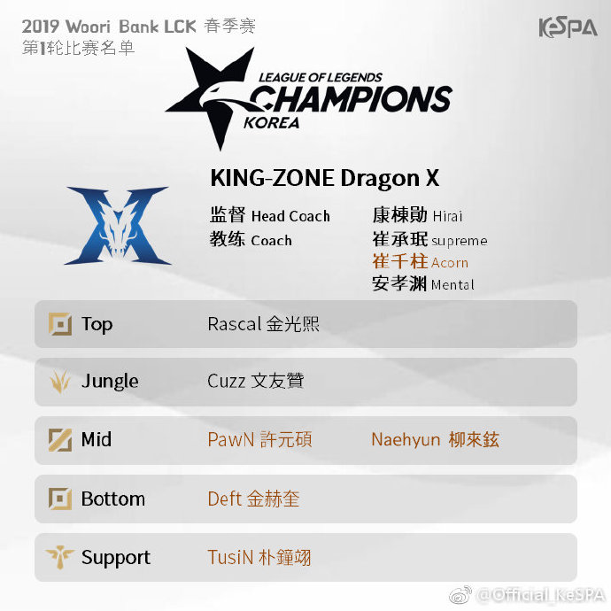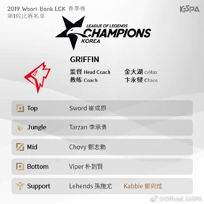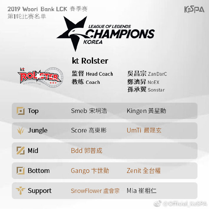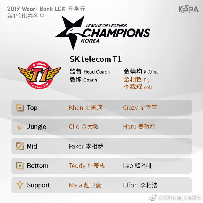 今日,韩国电竞协会官方微博公布了2019LCK春季赛首轮比赛的选手名单,十支战队即将于1月16日拉开战幕,新的一轮激战即将打响。