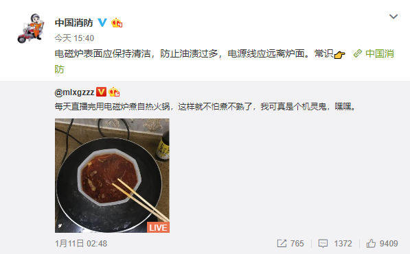 前一阵消灭了“仙女寝室”而大火的中国消防官博盯上了锅老师这条动态,精准指出了锅老师微博图中所潜藏的消防风险。