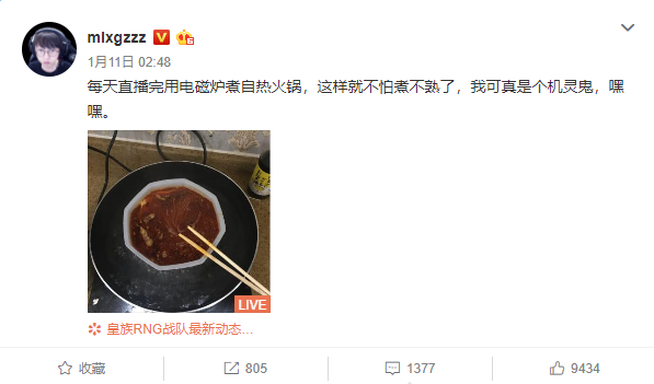 昨天RNG战队的打野选手香锅直播结束后,在微博上晒出了自己用电磁炉加热自热火锅的做法,十分机智!