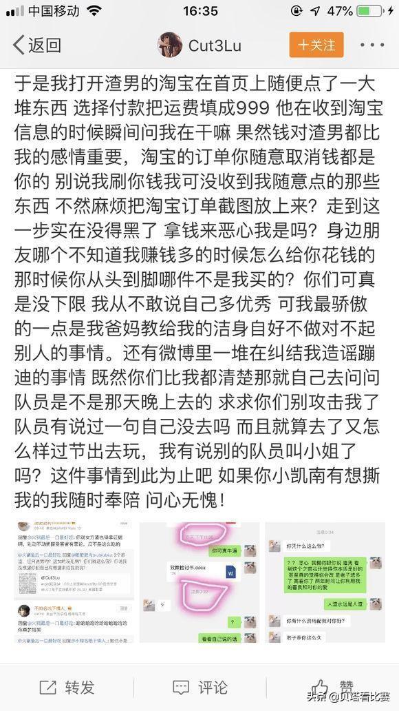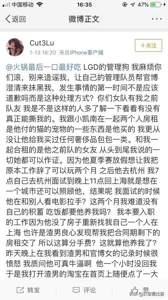 不过Lies女友看到了这篇反转文之后再次回应:这是LGD的管理层故意造谣自己,出了事情不去道歉,而是抹黑别人。这六万块是自己租的房子因为Lies不能租了,所以他帮忙付了剩下的房租,这不算分手费,这也不算是他在养我,而且自己盗刷他的银行卡是因为自己发消息,他不回,在淘宝上乱下单后他才回了自己,而且淘宝订单是可以随意取消的,钱一直都在他那里,自己从头到脚没有一件东西是他买的。