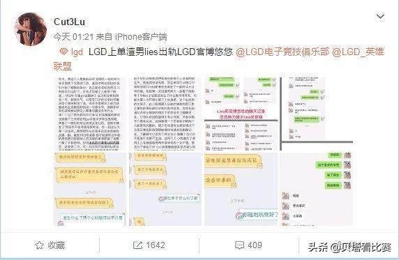 1月13日凌晨,在距离LPL春季赛开赛前一天,LGD的新人上单Lies的女友在微博上控诉自己被绿了,而且Lies的出轨对象还是LGD的官博悠悠,并且发布了大量的聊天记录证实,至少Lies在和女友交往期间喜欢上了悠悠是实情,出轨基本坐实。而且在Lies和女友的聊天记录中,Lies也威胁女友:大不了同归于尽!于是1月13日下午,就有人爆出了Lies的一些相关消息,表示其实是女友索要分手费,才故意抹黑Lies,现在Lies已经报警立案了。