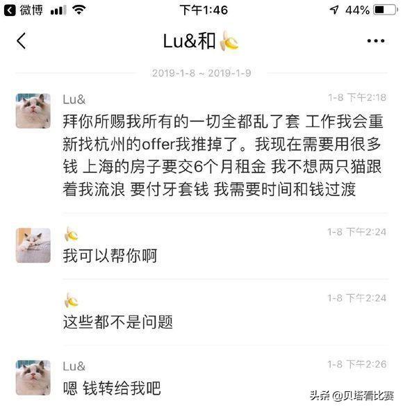首先Lies这边公布了一段1月8日和女友的聊天记录,可以看到女友表示自己现在的生活乱了套,工作要重新找,还要交6个月的租金,自己还带着两只猫,需要时间和钱过渡,Lies表示自己可以帮你,这些不是问题。于是女友回复:钱转给我吧。