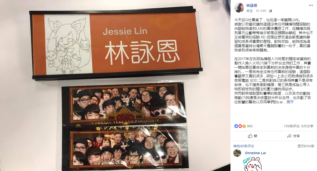 昨日,原LMS赛区著名女主持人,LPL赛区SN战队中单选手Maple的女友林咏恩(Jessie,又称RE)在脸书上po出了一张图片,并写了一篇长文,宣布正式告别LMS赛区。