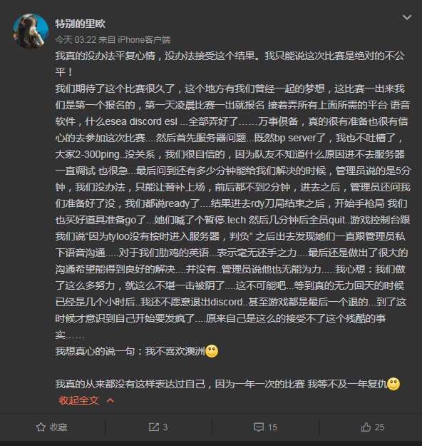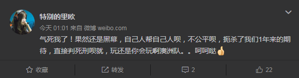 赛后TYLOO女队成员难以压抑自己的愤懑,直接在微博上吐槽澳洲队这一行为,原文如下: