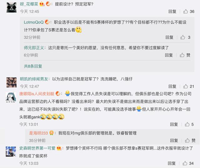 对于RNG衣服印冠军奖杯一事网友们也是议论纷纷,有网友表示“RNG这样做确实不妥,很容易引起争议,在没有拿到S赛冠军情况下印这种图案这是预定冠军吗?很多人说这是工作人员失误可以理解,但俱乐部也是公司吧?作为公司品牌运营那边的人不看图稿吗?竟然没人看出来?”