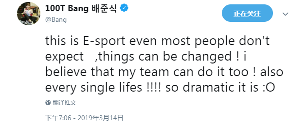 作为曾经的队友,Bang在加入北美战队100T后目前也在联赛末尾苦苦挣扎,老朋友创造奇迹获胜的消息也让他大受鼓舞。他在个人推特上恭喜了Peanut,并且发出了自己的感慨。