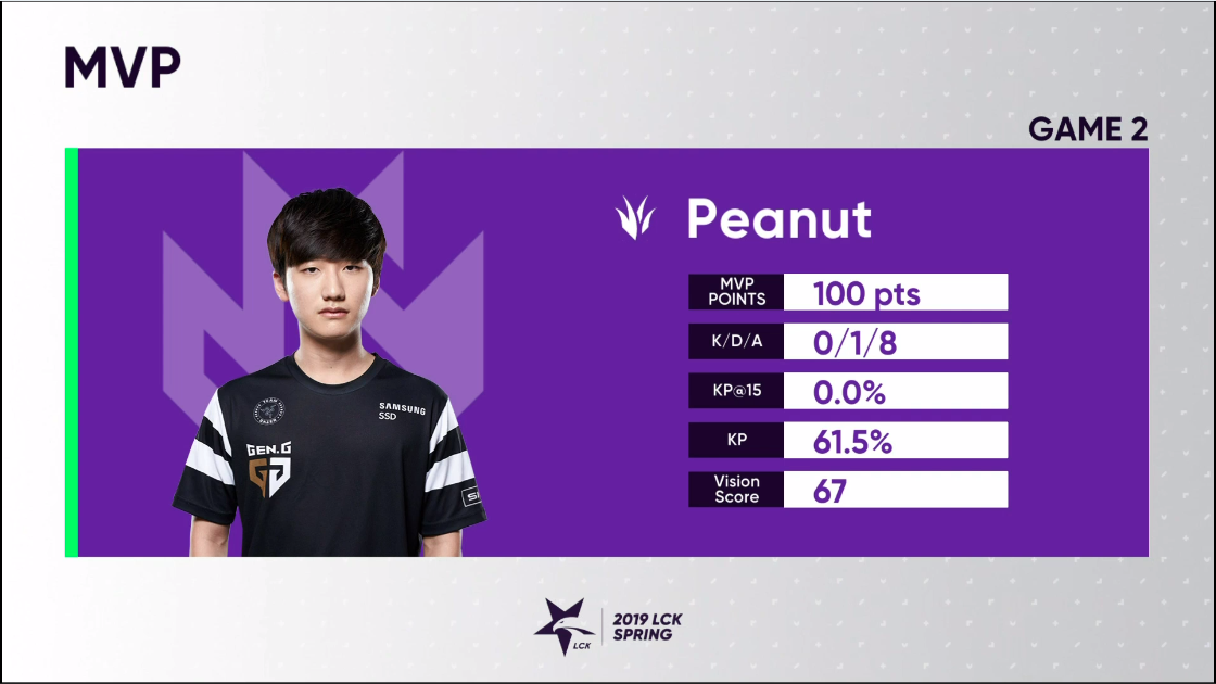 Peanut在加入Gen.G后一直因为低迷的发挥饱受指责,但在今天决定性的击败Griffin的比赛中,他的扎克为队伍打开了局面,他也获选本场比赛的MVP。
