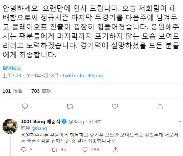 北京时间今日,伴随LCS春季常规赛第八周的比赛全部打完,100T战队在今日继续败北之后,成为北美第一支彻底无缘季后赛的队伍。赛后,已经在推特上沉寂了一段不短时间的Bang用韩语发推,就成绩和发挥一事向所有的粉丝们致歉。