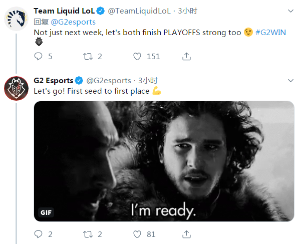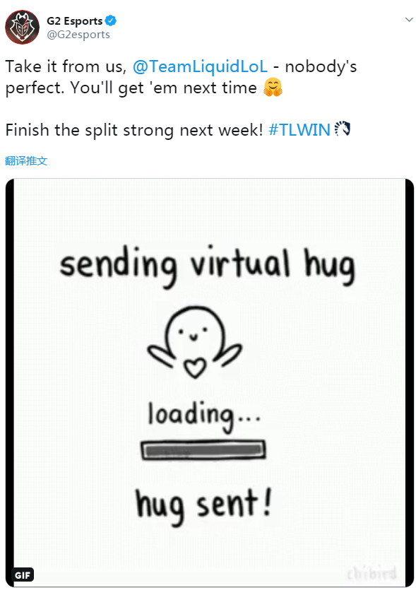 不过这场比赛并不影响TL战队排在北美第一。赛后,欧洲赛区常规赛第一,最近一波连败收尾常规赛的G2战队在推特上为TL战队应援。