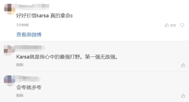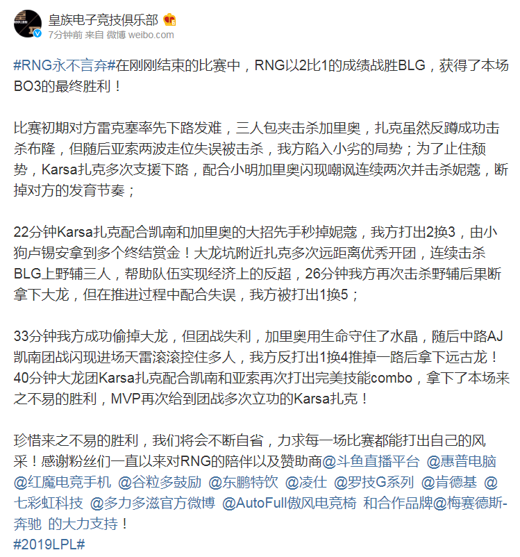2019LPL春季赛,RNG战队主场迎战BLG,让一追二击败了对手,成功锁定季后赛席位。在第三局比赛多次陷入劣势时,Karsa的扎克多次绝命开团,为RNG寻找到了打开局面的钥匙。赛后RNG官博发布赛果通报,粉丝们纷纷发表评论。