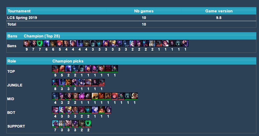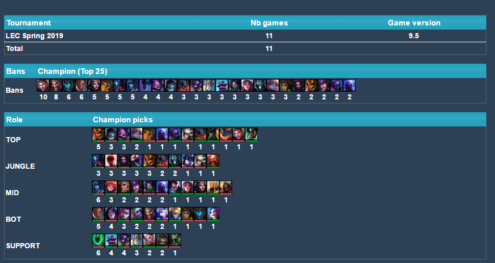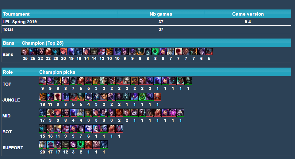 ban榜前列的英雄被ban次数都差不多,大约每场比赛你总会见到被ban前六的硬性里面被ban掉几个。选人方面上单最平均,其他位置还是有大热英雄的。