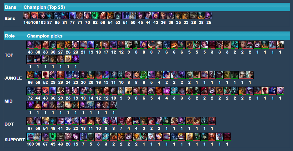 布隆的选取率世界第一,与辅助不怎么被ban也有一定影响。同时辅助也是全世界范围内选择相对而言最单调的(只统计10次以上的较大样本)