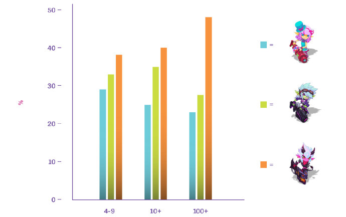 不过我们还得弄清楚:主玩崔丝塔娜,把火箭跳跃用得炉火纯青的玩家是否也选择了这款皮肤?答案毫无悬念。请看图2,场次分别为4-9,10场以上和100场以上崔丝塔娜玩家投票的图表。